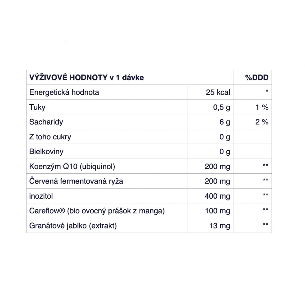 Koenzým Q10 (ubiquinol), červená fermentovaná ryža, inozitol, Careflow® (bio ovocný prášok z manga), extrakt z granátového jablka